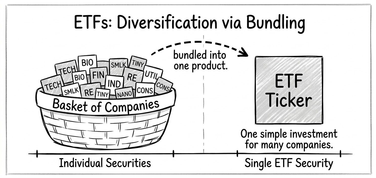 An ETF is a fund that holds a basket of assets. ETFs are often designed to track a specific index and can trade on an exchange like other equities. What distinguishes ETFs from indices is that, if you buy an S&P 500 ETF, you are buying a single instrument that gives you exposure to 500 companies simultaneously. The fund automatically rebalances as companies enter or exit the index.