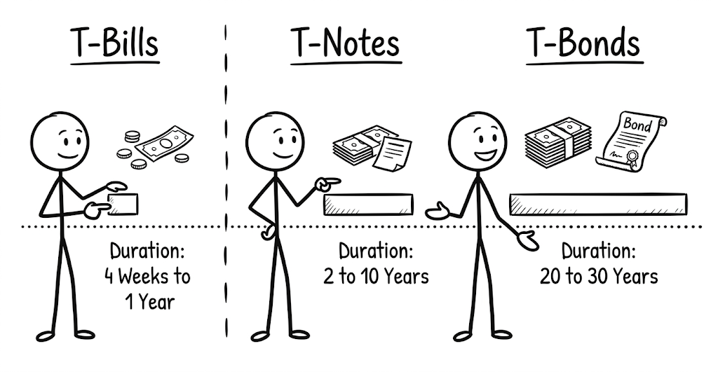 Governments, like all entities, need capital to survive. To get that capital, it borrows from investors by issuing debt. In the United States, that debt is issued by the Department of the Treasury and comes in different forms depending on how long the government needs to borrow for.